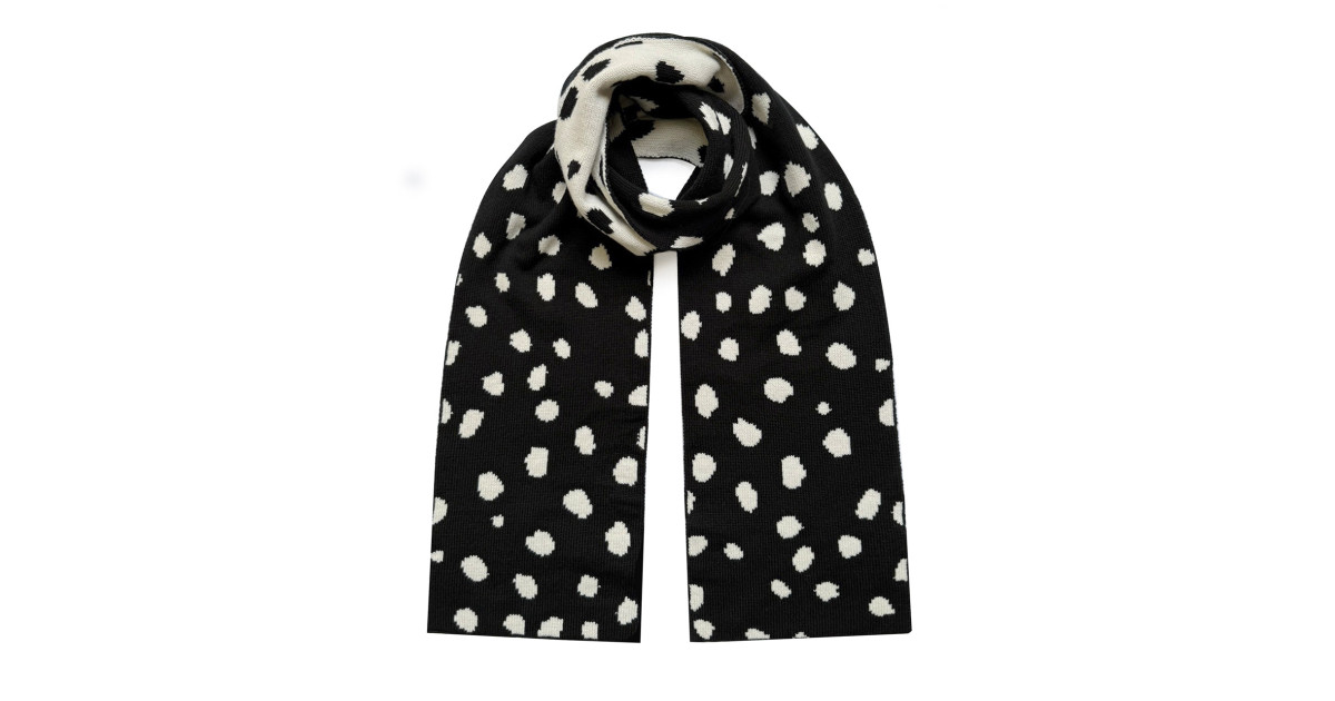 Elevate your winter wardrobe with this elegant black and white scarf, designed and knitted in North London. Featuring a stylish scattered dotted pattern, this luxury scarf is crafted from ethically sourced Italian yarns; a premium blend of 90% wool and 10% cashmere.