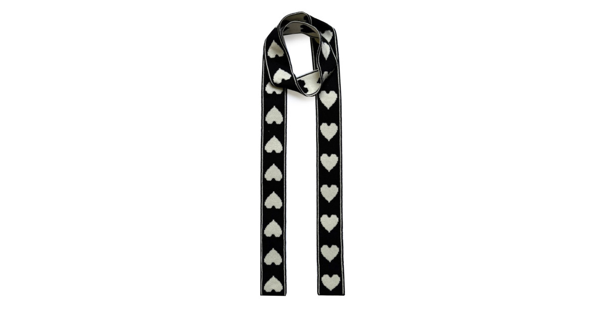Add a touch of love to your winter wardrobe with this elegant slim scarf, knitted in North London and adorned with a charming black and white heart pattern. Crafted from ethically sourced Italian yarns, this luxurious blend of 90% wool and 10% cashmere offers warmth, softness, and timeless style.