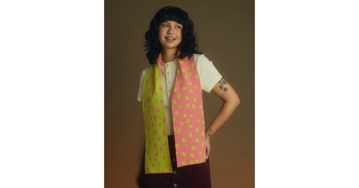 Elevate your winter style with this chic pink and yellow scarf, lovingly designed and knitted in North London. Showcasing a trendy scattered dotted motif, this luxurious scarf is crafted from ethically sourced Italian yarns, featuring a rich blend of 90% wool and 10% cashmere.