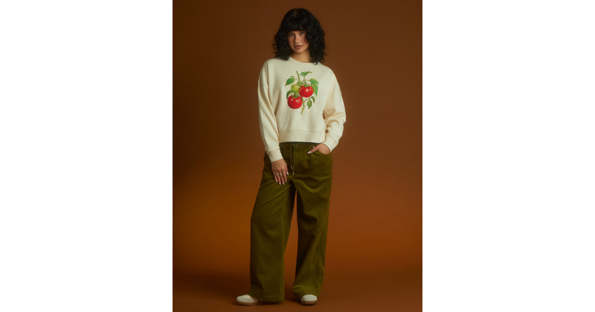 Large tomato embroidery adds a fun and vibrant detail to the chest